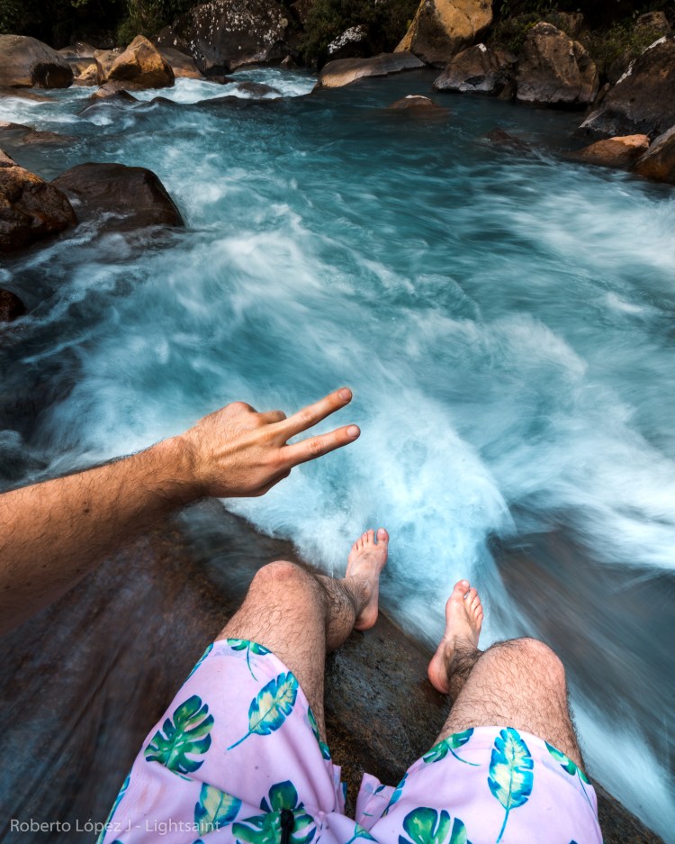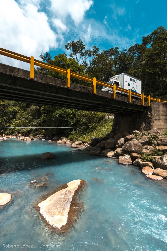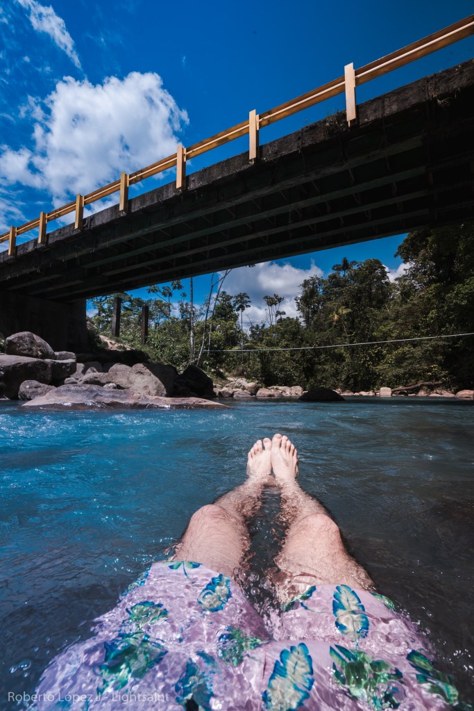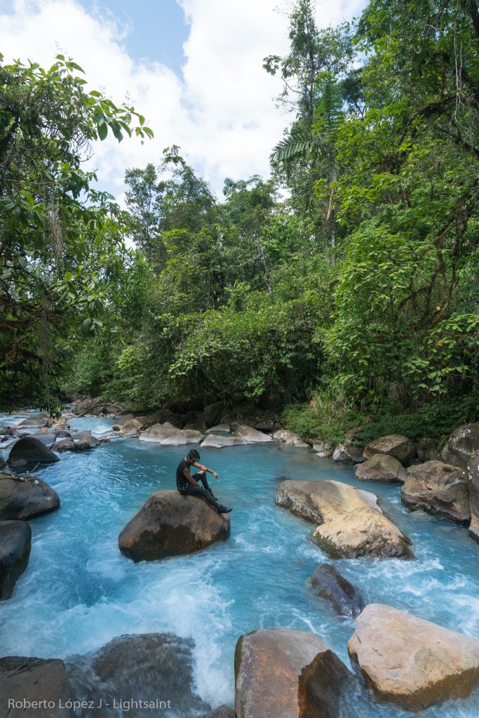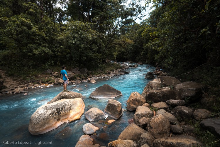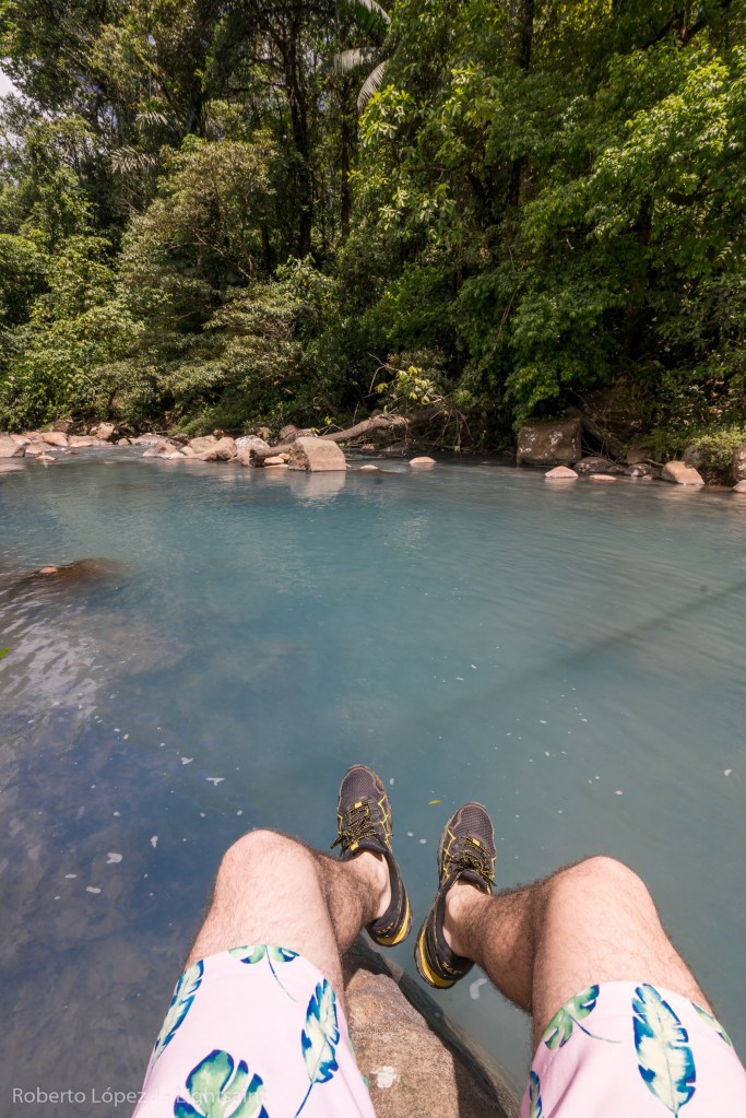 Salimos de la Fortuna hacia Rio Celeste sin saber realmente dónde nos íbamos a quedar, pero la verdad es que eso no importaba. El camino hacia el sitio es impresionante, con verde de ambos lados y el cono perfecto del Arenal alejándose poco a poco. Noel poniendo música y disfrutando cada pieza de copiloto y Carlos atrás, como siempre un poco reservado y pensativo en el asiento de atrás. Todos gozando del momento y la experiencia con el día increíble. Llegamos a los primeros ríos y ya el color comenzó a cambiar hasta que llegamos al último rio antes del parque y estaba totalmente celeste. Les dije que nos detuviéramos porque yo no aguantaba la sonrisa. Nos detuvimos a hacer fotos y estando ahí dejé la cámara al lado del rio al igual que mi camisa y me metí. Ese sentimiento de estar ahí rejuvenece el alma.