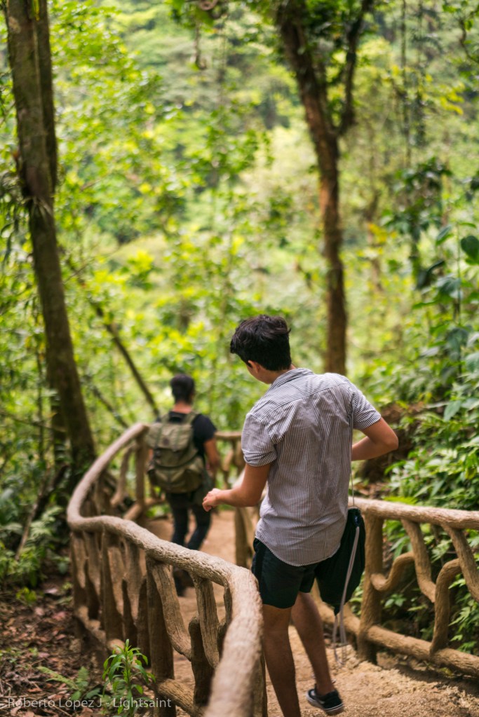Poco después llegamos a la entrada del parque e hicimos la caminata. No es nada lejos de la entrada, si acaso 30 minutos hasta la catarata bajando gradas. La catarata es increíble y la energía que se siente ahí es espectacular. Los tres asomábamos una sonrisa sólo con ver ese esplendor de colores. Éramos ya los últimos en el parque y aún así subimos a la poza que está más arriba de la catarata y ahí nos quedamos un tiempo en silencio, admirando los colores y recargando energías. Incito a quien pueda ir a que vaya a conocer y simplemente admirar. Es increíble.